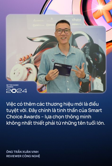 Xuất hiện tại sự kiện với phong cách thân thiện, Vinh Vật Vờ – một trong những reviewer công nghệ hàng đầu Việt Nam – đã nhanh chóng thu hút sự chú ý. Khi được hỏi về sự xuất hiện của nhiều thương hiệu mới tại Smart Choice Awards 2024, anh cho biết: “Sự có mặt của các thương hiệu mới thật tuyệt vời. Những tên tuổi lớn như Samsung, Apple, LG đã quá quen thuộc, nhưng chính những thương hiệu mới với sản phẩm sáng tạo và giá cả hợp lý mang đến sự lựa chọn đa dạng cho người tiêu dùng. Đây chính là tinh thần của Smart Choice Awards – lựa chọn thông minh không chỉ đến từ những cái tên lớn.”