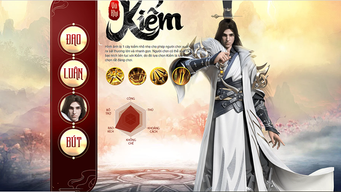 - Hiệp Sĩ Kiếm: Nhân vật tấn công linh hoạt với tỉ lệ Bạo kích cao, đặc biệt là khiến kẻ thù phải kích động.