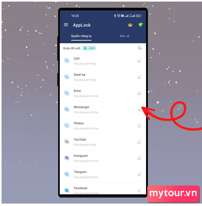 Một phương pháp để khóa ứng dụng trên Vivo là thêm ứng dụng bạn muốn khóa vào danh sách các ứng dụng được bảo vệ bởi AppLock. Hãy lướt xuống, tìm và nhấn vào ứng dụng đó, sau đó chọn biểu tượng khóa bên cạnh.