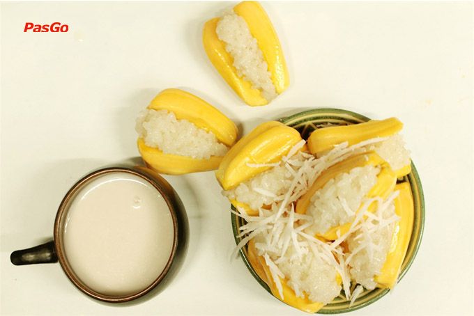 - Cuối cùng bạn rưới phần nước cốt dừa đã nấu lên từng múi xôi mít, sau đó rắc dừa sợi và lạc (đậu phộng) rang sẵn lên trên là có thể dùng ngay.