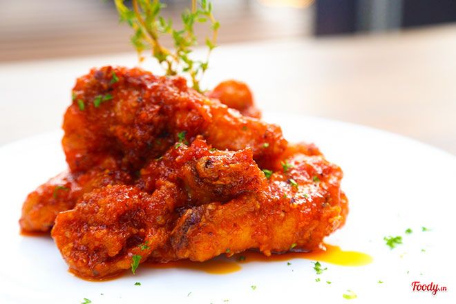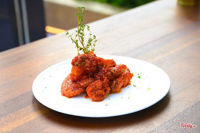 Cánh gà cay - Spicy Chicken WingCánh gà được bọc trong một lớp bột mỏng, tẩm sốt cay để tạo ra hương vị đặc biệt. Thịt gà thơm mềm, không bị khô như những nơi khác. Ăn cánh gà cay nóng hổi kèm với một chai bia lạnh mát thì thật là tuyệt vời!