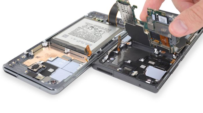 Samsung áp dụng buồng hơi (màu vàng) trên Galaxy S20 Ultra (bên trái) và tấm tản nhiệt bằng graphite (màu xám đen) trên Galaxy Note 20 Ultra (bên phải).