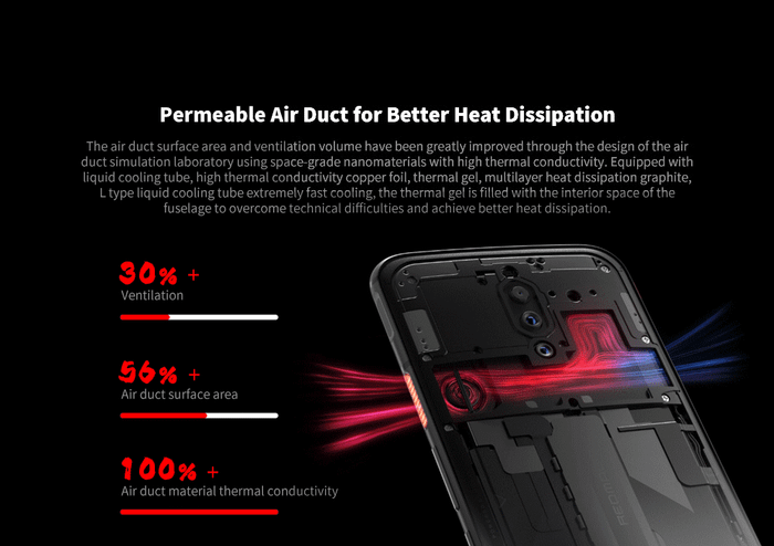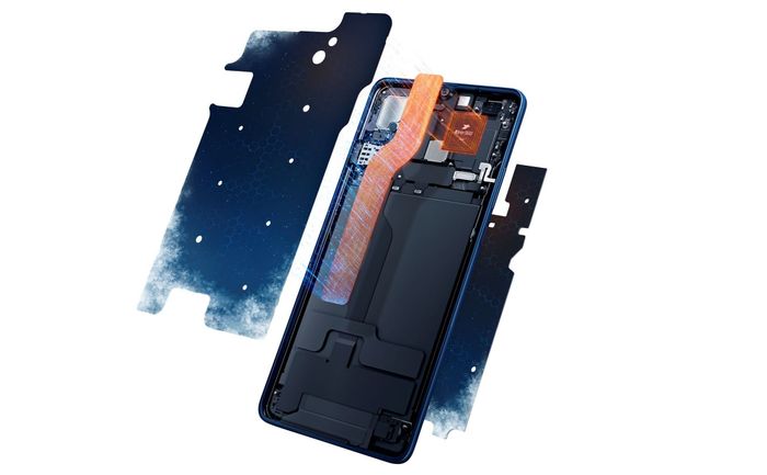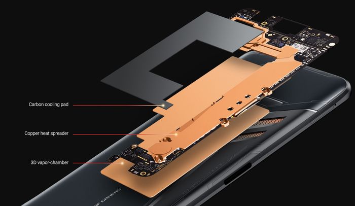 Hệ thống tản nhiệt đa lớp bao gồm buồng hơi 3D vapor-chamber, tấm đồng khuếch tán nhiệt và tấm làm mát bằng carbon trên ASUS ROG Phone.