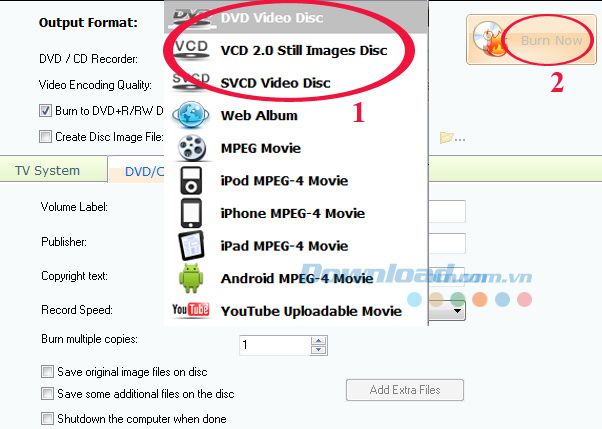Nếu muốn xuất Album ra đĩa CD/DVD, khi nhấn vào nút xổ xuống ở mục Output Format, bạn chọn 1 trong 3 định dạng trên cùng, sau đó nhấn Burn Now.