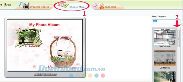 Bước 5: Sau đó, nhấn vào tùy chọn Choose Menu để tạo menu cho Album. Các mẫu menu nằm ở phía bên phải màn hình, bạn có thể lựa chọn theo ý của mình.