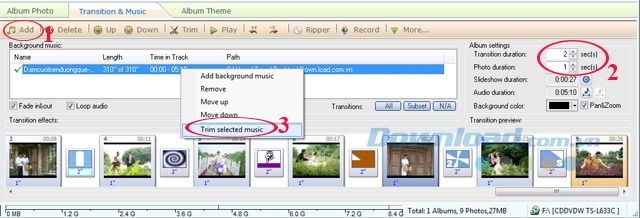 Bước 3: Tiếp theo, hãy chuyển sang thẻ Transition & Music, sau đó nhấn vào nút Add để thêm nhạc vào Album. Ở mục Album Settings, bạn cần thiết lập các thông số sau để chỉnh sửa hiệu ứng chuyển ảnh: