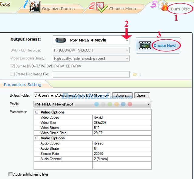Bước 6: Cuối cùng, nhấn vào tùy chọn Burn Disc để xuất Album. Tại mục Output Format, nhấn vào nút xổ xuống để chọn định dạng đầu ra. Sau khi thiết lập xong tất cả, nhấn Create Now để bắt đầu tạo video.