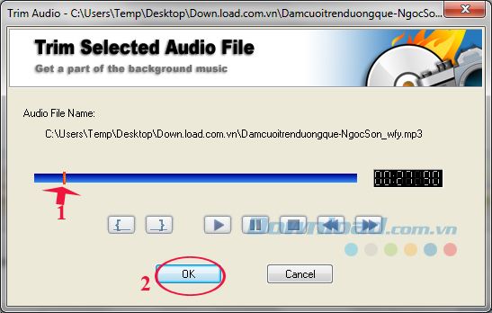 Cửa sổ Trim Audio hiện ra, bạn hãy cắt đoạn nhạc theo thời gian trình diễn ảnh, sau đó nhấn OK để lưu lại thiết lập.