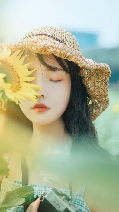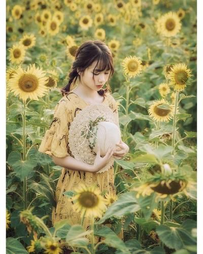 Bước đầu tiên để tạo dáng với hoa hướng dương là hãy tỏ ra thật trầm tư nàng nhé. Chụp hình giữa cánh đồng hoa cơ mà, chỉ cần nửa phần cơ thể, chụp kiểu chân dung, ánh mắt nhìn xuống hay hơi buồn một tí. Vào ngày có gió, tóc bay lên sẽ tạo nên vẻ đẹp đặc biệt. Nàng chỉ cần khoanh tay nhẹ nhàng là đã có một dáng đẹp. Bởi vì kiểu ảnh này chụp trực tiếp nên nàng nào tự tin thì chọn ngay nha.
