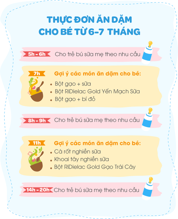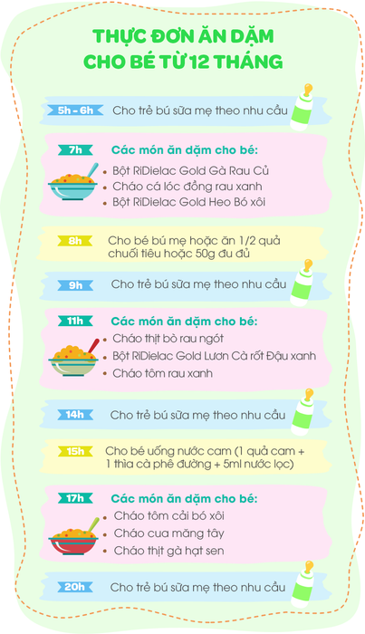 Mẹ có thể sử dụng các loại bột ăn dặm Ridielac Gold cho bé vào lúc 7h sáng và 11h trưa để đảm bảo dinh dưỡng. Các loại bột ăn dặm phù hợp với hệ tiêu hóa của trẻ ở giai đoạn này bao gồm: