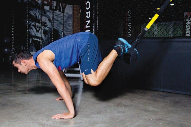 Thực hiện động tác: Kéo dài hoàn toàn dây đai TRX và đứng quay về phía điểm neo. Bắt đầu với tay mở rộng ngay dưới vai, đẩy vào tay cầm của dây đai. Giữ cơ thể ở tư thế plank thẳng, hạ người xuống cho đến khi khuỷu tay ở góc 90 độ. Duỗi thẳng tay và gồng cơ thể khi bạn đẩy trở lại vị trí ban đầu.