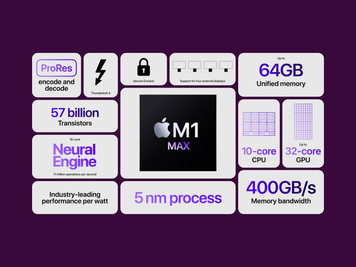 M1 Pro có CPU 10 nhân (tăng từ tám nhân trên M1), với tám nhân hiệu suất cao và hai nhân hiệu suất hiệu quả. Đối với đồ họa, M1 Pro cung cấp GPU lên đến 16 nhân (với tối đa 32 GB bộ nhớ thống nhất) nhanh gấp đôi so với M1. Trong khi đó, M1 Max có cùng CPU 10 nhân nhưng đi kèm với GPU 32 nhân (hỗ trợ tối đa 64 GB bộ nhớ thống nhất). Apple khẳng định cả M1 Pro và M1 Max đều nhanh hơn tới 70% so với M1 năm ngoái, và về đồ họa, M1 Pro nhanh gấp đôi và M1 Max nhanh gấp bốn lần.