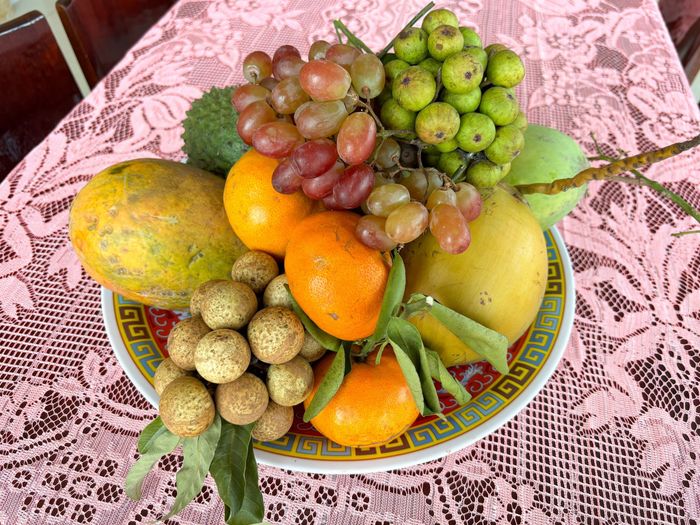 Ở nhà tôi, mâm trái cây thường có nhiều hơn 5 loại quả. Ngoài 5 loại cơ bản đã kể, chúng tôi còn thêm nho, nhãn, quýt để làm đẹp và là những loại quả mọi người trong nhà đều thích. Chúng tôi tránh sử dụng các loại trái có âm thanh gần giống với từ có ý nghĩa không tốt như chuối (chúi nhủi, không phát), cam (cam chịu), lê (lê lết),…Thịt kho hột vịt và canh khổ qua