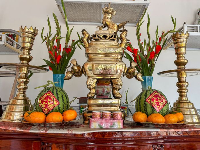 Nếu trên bàn thờ có cặp dưa hấu, thì bên cạnh đó bàn dài cần có mâm trái cây ngũ quả.