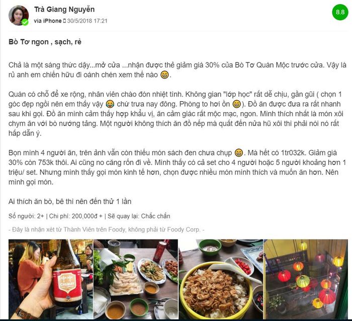 Để bạn có cái nhìn chân thật nhất về Bò Tơ Quán Mộc Nguyễn Phong Sắc, dưới đây là một số đánh giá từ phía khách hàng: