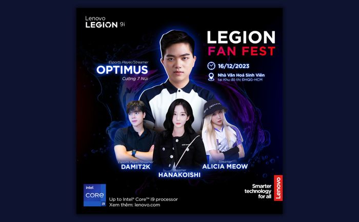 Lenovo Legion Fan Fest sẽ tụ tập những khách mời nổi tiếng trong thế giới game như Trần “Optimus” Văn Cường (LoL), Damit2K (Valorant), Alicia Meow (streamer), Hanakoishi…. Cơ hội nhận những phần quà hấp dẫn như Lenovo LOQ, Ba lô Legion phiên bản giới hạn, tai nghe Legion, chuột Legion,… đang chờ đợi anh em tham dự.Những ai quan tâm có thể đăng ký tham gia sự kiện tại đây.