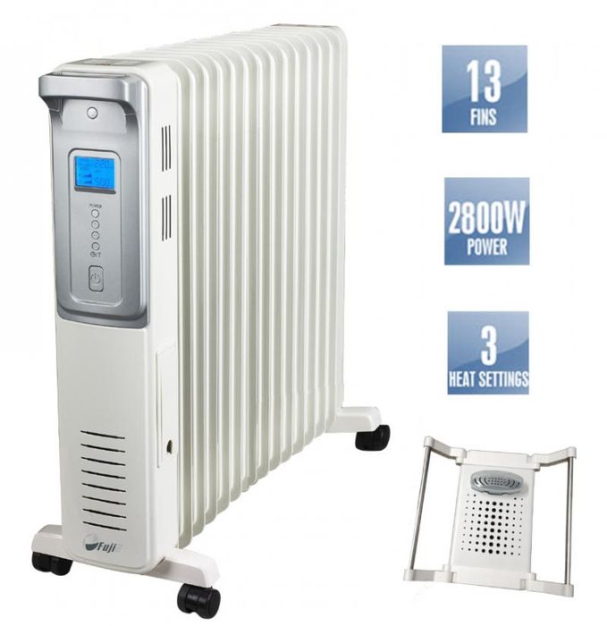 The FujiE Oil Heater OFR4413 features multiple heating panels, oil conduits for efficient heating, and a clothes-hanging hook for drying clothes. It also includes digital temperature control, a lock function, and ECO mode to save energy.