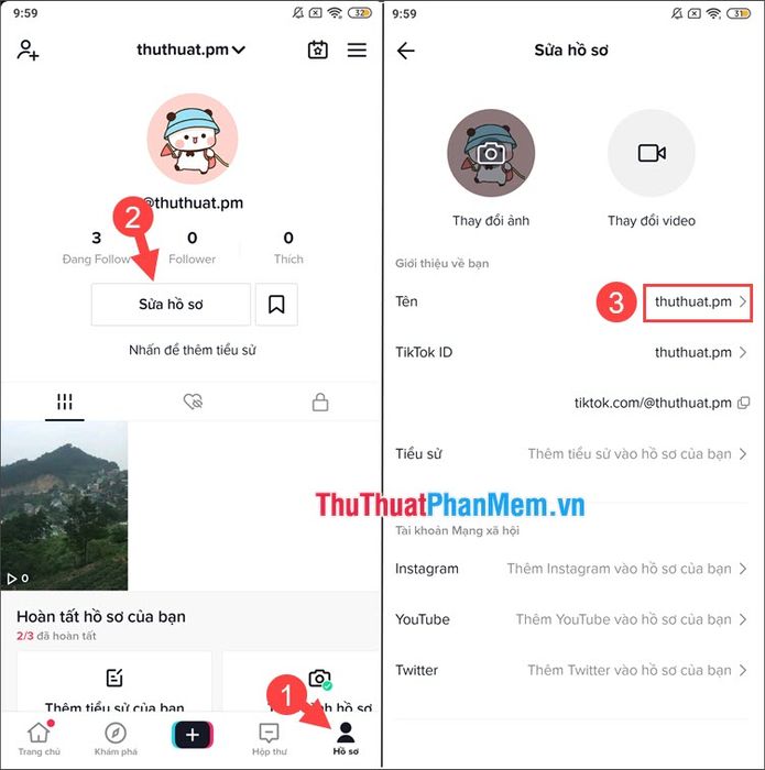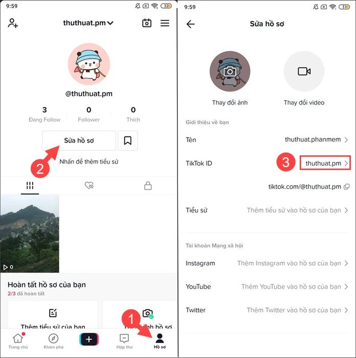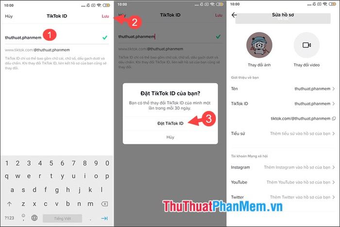 Step 1: On the TikTok app, tap on Profile (1) => Edit Profile (2) => TikTok ID (3).