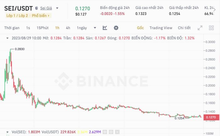 Biến động giá của SEI trong khung thời gian 1 ngày, được chụp vào ngày 29/08 trên sàn BinanceMytour