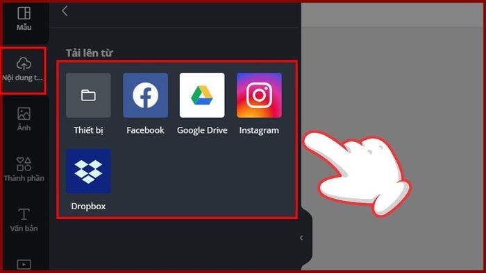 Bạn có thể tải ảnh, video từ thiết bị, mạng xã hội (Facebook, Instagram), Google Drive hoặc Dropbox