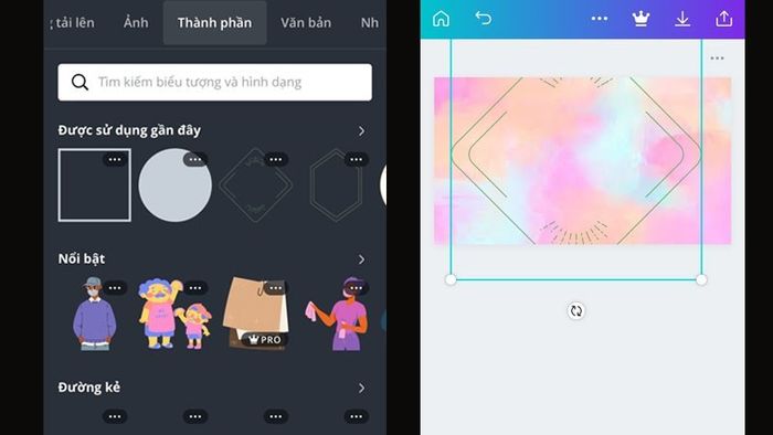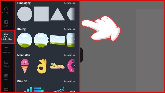 Bước 4: Bạn có thể thêm các mục, nhãn dán, khung, biểu đồ vào thiết kế bằng cách chọn mục Thành phần và lựa chọn hình ảnh ưa thích.
