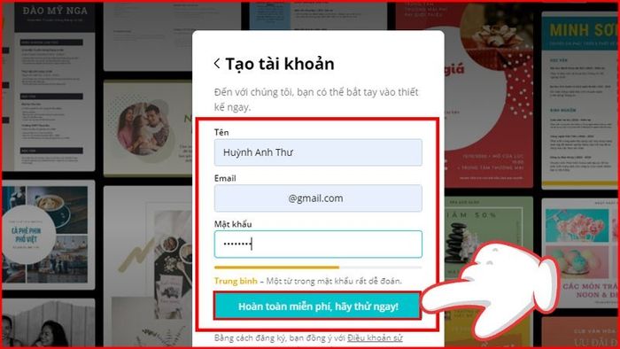 Bước 3: Nhập Tên, Email và Mật Khẩu Đăng Nhập (Sử Dụng Chữ và Số Để Nâng Cao Độ Bảo Mật). Nhấn Enter hoặc Hoàn Toàn Miễn Phí, Hãy Thử Ngay Để Hoàn Thành Thủ Tục Đăng Ký.