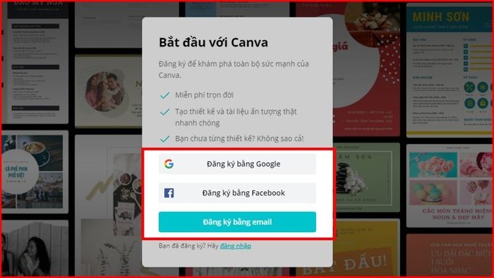 Bước 2: Đăng Ký Tài Khoản Bằng 3 Cách. Nếu Chọn Đăng Ký Bằng Facebook và Google, Canva Sẽ Tự Động Chuyển Đến Trang Chủ với Tài Khoản Liên Kết 2 Ứng Dụng Này Của Bạn. Nếu Không Muốn Liên Kết 2 Tài Khoản Này, Hãy Chọn Đăng Ký Bằng Email.