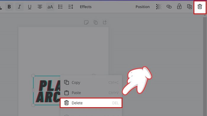 Nếu muốn xóa font đã chọn, hãy chọn chữ và nhấn vào biểu tượng thùng rác hoặc chuột phải và chọn Xóa. Thực hiện thao tác tương tự để xóa các chi tiết khác, hình ảnh.