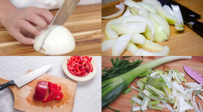 Tỏi sau khi bóc vỏ, bạn băm nhỏ. Hành tây sau khi rửa sạch, cắt múi cau. Ớt đỏ cắt miếng nhỏ. Hành Baro cắt khúc vừa ăn.