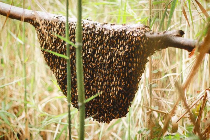 Trên kèo gác, đàn ong bu kín tổ mật, không chừa một kẽ hở. Nếu không có ánh sáng mặt trời, mảng màu đen này trông như không gì khác ngoài một bức tường, nơi tạo ra những dòng mật ngọt ngào.