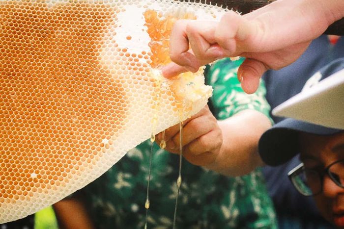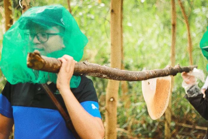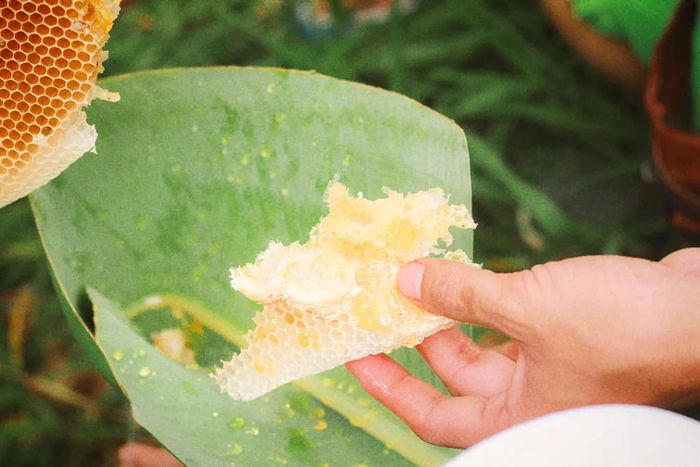 Nhẹ nhàng nhấn vào tổ ong, lớp mật vàng óng ánh chảy ra, khiến đoàn mình phải vội vã sử dụng lá chuối và chai nước suối để hứng, bởi vì họ không muốn lãng phí giọt mật ong thiên nhiên tuyệt vời này.