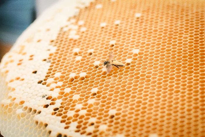 Đưa tổ ong ra khu vực rộng lớn để trực tiếp thưởng thứcTừng khoang lục giác xen kẽ trên bề mặt tổ như một tác phẩm sắp xếp hoàn hảo của tự nhiên. Phần mép tổ có màu trắng, dần chuyển sang vàng và nâu đậm tại trung tâm do nhiều mật tập trung.