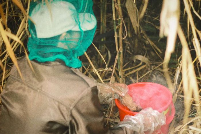 Thợ ong đốt bùi nhùi, đặt vào xô và mang vào tổ. Dưới tác động của khói, đàn ong rơi ra như “ong vỡ tổ”, tiếng rì rì của cánh ong làm đoàn mình sửng sốt. Ông Hon nhắc nhở nếu ong bám vào người thì đứng yên, không được xua đuổi, vì vậy mình chỉ có thể bình tĩnh bước đi, trong tim nhấp nhô lo sợ. Rất may là suốt chuyến đi, mình không bị chích một lần nào.