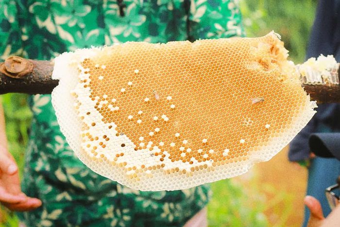 Sử dụng tay bẻ một miếng sáp ong và thưởng thức mật ong tự nhiên chưa qua xử lýMặc dù không thích ngọt, nhưng mình vẫn bị cuốn hút bởi màu sắc và vẻ đẹp của tổ ong rừng với những ô lục giác nhỏ xinh. Dưới ánh nắng hè, lớp mật tỏa sáng rực rỡ.