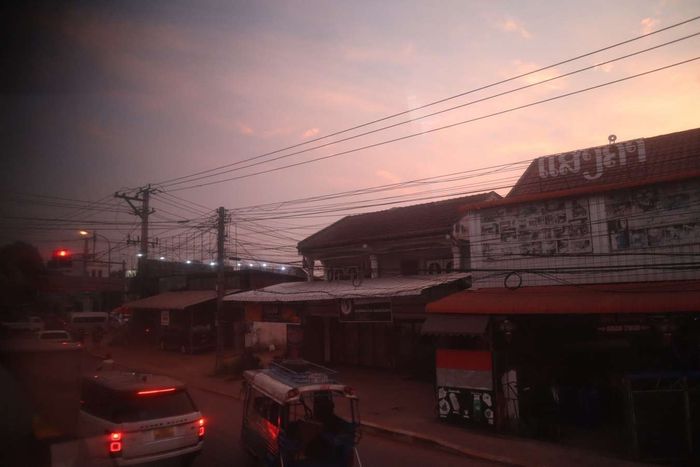 Chúng tôi 'hạ cánh' tại bến xe Viêng Chăn, được đón bằng bức tranh hoàng hôn tím hồng tuyệt vời của thủ đô này. Mặt trời như một trái tim đỏ lớn chiếu sáng những đám mây cam hồng phía xa xăm. Sau đó, chúng tôi di chuyển bằng tuk tuk (50,000KIP/người - khoảng 75,000VND) vào trung tâm thành phố để khám phá những điểm độc đáo ở đây!