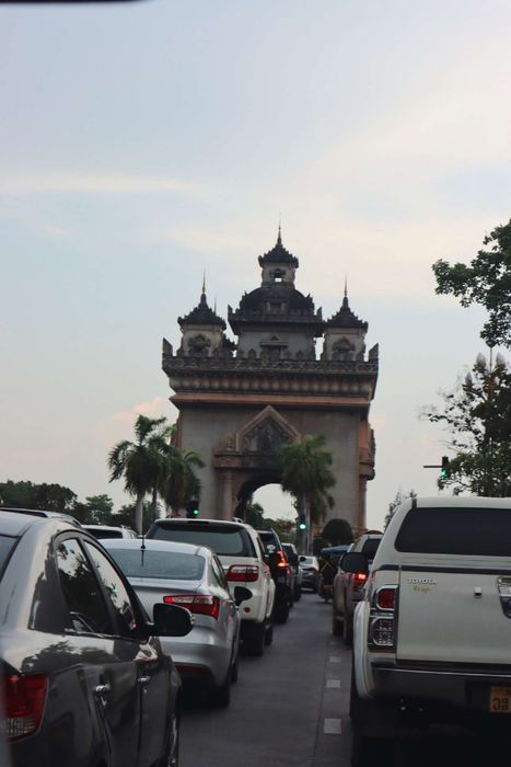 Dòng xe liên tục về phía Patuxay, tạo nên hình ảnh sống động của thành phố.