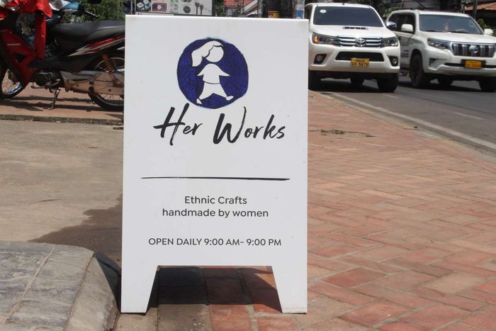 Ấn tượng bởi logo độc đáo của Her works - hình ảnh một cô gái không ngừng bước đi về phía trước, tượng trưng cho sứ mệnh của thương hiệu là đưa sản phẩm truyền thống của phụ nữ Lào đến gần hơn với người tiêu dùng.