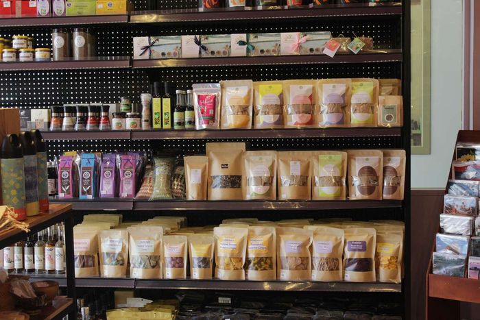Gian hàng thực phẩm khô và tinh dầu của thương hiệu địa phương.