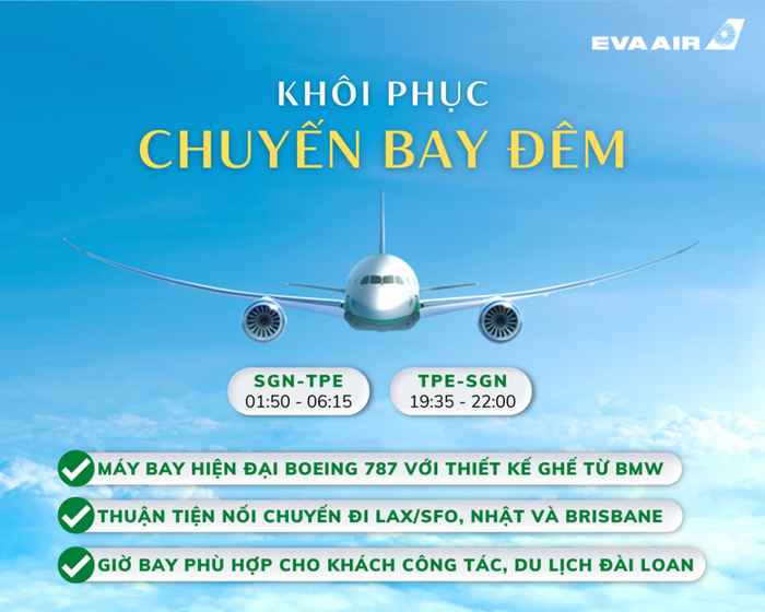 – Từ ngày 26/03/2023, EVA Air sẽ mở lại các chuyến bay đêm (RED-EYE flight) xuất phát lúc 1h50 sáng.