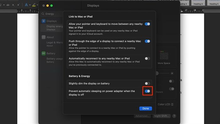 Bước 3: Mở phần cài đặt Advanced trong trang Display, tại mục Battery & Energy > bật Prevent automatic... để ngừng tự động Sleep của máy tính.