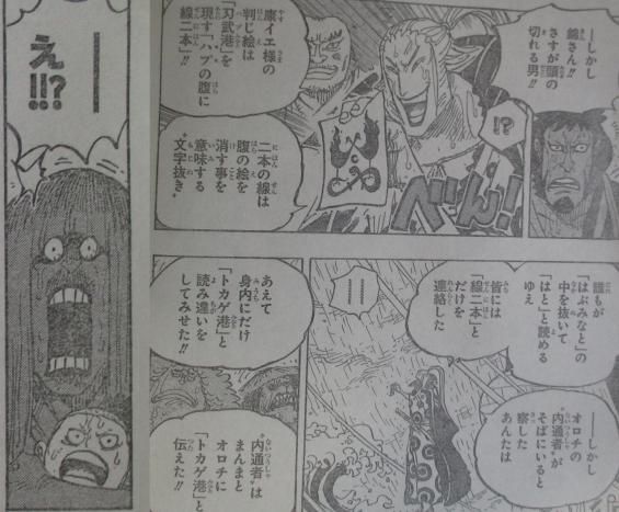 Denjiro tiết lộ rằng lý do mà nhóm Luffy đã phải thực hiện lại toàn bộ kế hoạch lớn này là vì anh nhận ra Kinemon đã đọc sai chỉ dẫn của Lãnh chúa Yasu. Có thể Kinemon nhận ra có người phản bội trong Cửu Hồng Bao, nhưng anh ta đã đọc nhầm.