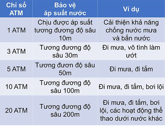 Tùy thuộc vào chỉ số ATM, thiết bị sẽ chịu áp suất nước ở độ sâu tương ứng.