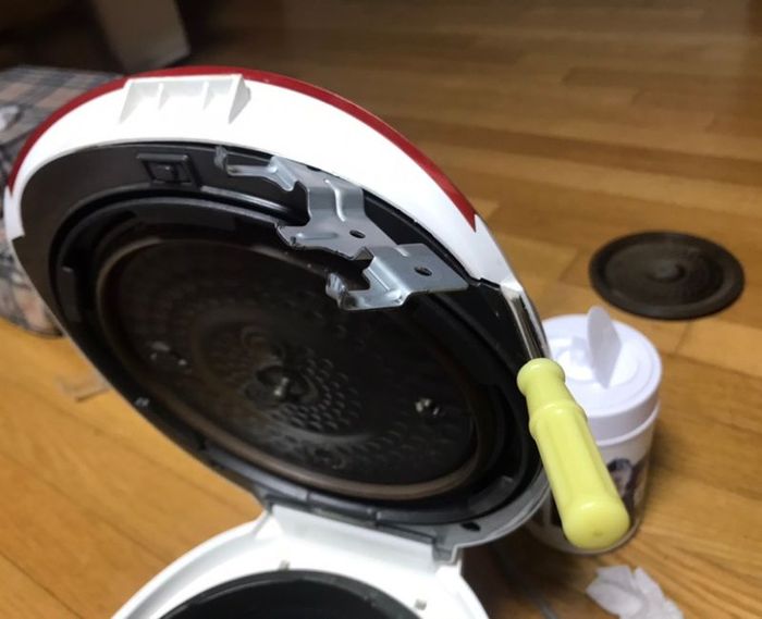 Sử dụng tua vít để gỡ lớp nhựa bên trong nắp nồi.