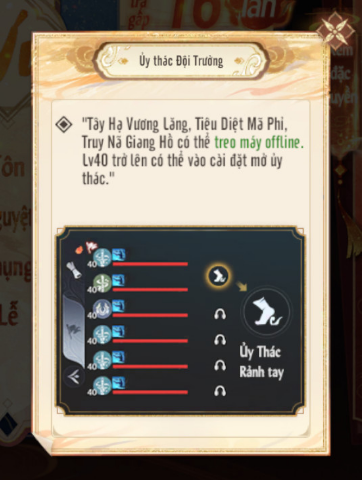 Nói một cách thật đơn giản thì khi sử dụng tính năng này, chủ "party" sẽ trổ tài gánh team và làm được một số nhiệm vụ hoặc hoạt động hằng ngày cho thành viên trong đội mà họ không cần phải online. Chỉ cần chọn Ủy Thác cho đội trưởng rồi yên tâm đăng xuất, và khi trở lại game thủ sẽ thấy cả núi đồ và phần thưởng nhiệm vụ đã nằm trong hành trang của mình. Nhưng lưu ý, để sử dụng tính năng này thì game thủ phải đạt level 40 và thỏa mãn một số điều kiện đi kèm.