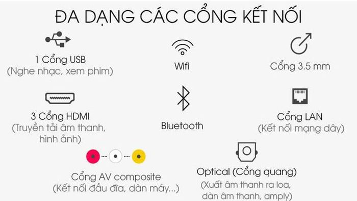 Tivi được trang bị nhiều cổng kết nối như USB, Wifi, cổng 3.5 mm, HDMI (truyền tải âm thanh và hình ảnh), Bluetooth, LAN (kết nối mạng), AV composite (kết nối đầu đĩa, amply) và quang (xuất âm thanh ra loa).