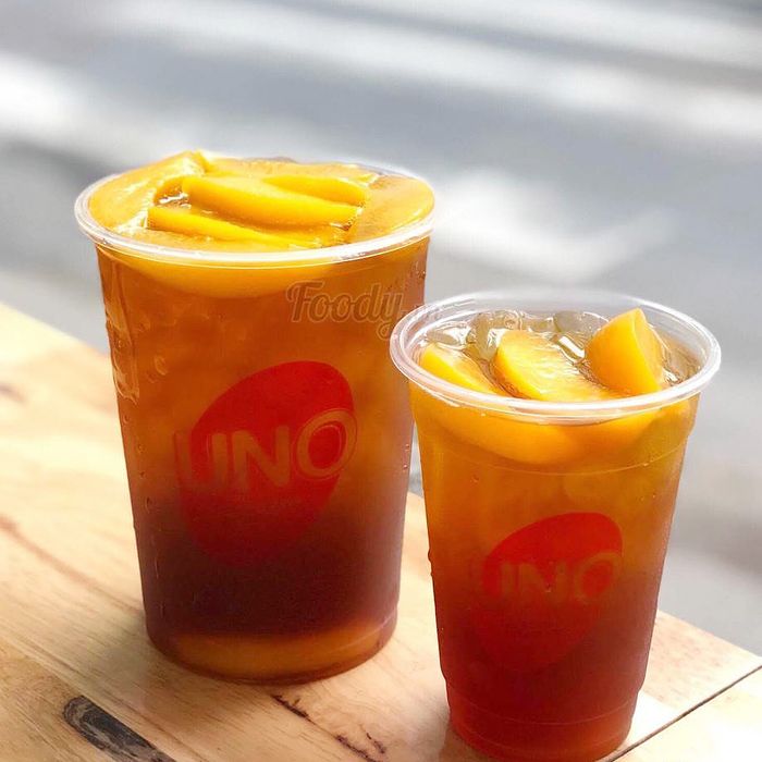 Thương hiệu Uno nổi tiếng với ly trà đào khổng lồ, ly 1 lít to đùng luôn, đầy ắp miếng đào giòn ngọt, cắn một phát lạnh tê buốt, thưởng thức trà đào ở đây là điều không thể bỏ qua.
