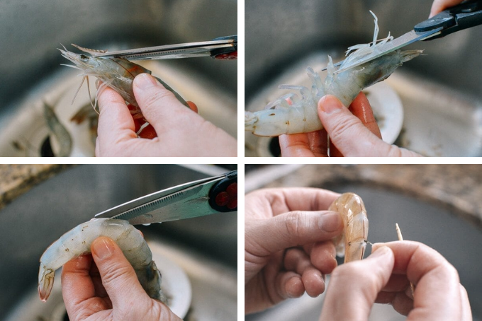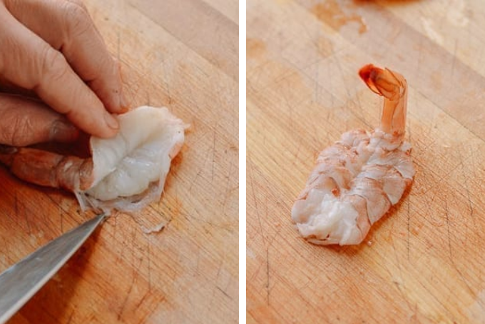 Nhẹ nhàng lột bỏ vỏ của tôm, chỉ giữ lại phần vỏ mỏng kết nối với đuôi. Nếu bạn muốn, có thể sử dụng dao để cạo phần đuôi, loại bỏ chất lỏng bên trong, điều này thực sự tạo ra kết quả ấn tượng.
