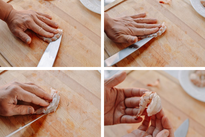 Đặt con tôm nằm nghiêng với bụng phía trước. Giữ chặt tôm bằng một tay, sử dụng đầu dao để tách vỏ ở phần đuôi của tôm. Tiếp theo, áp dụng áp lực nhẹ nhàng nhưng đều để đẩy dao xuống giữa, đến khi nó chạm lưng tôm. Hãy nhớ dừng lại trước khi đến phần đuôi của tôm! Sau đó, loại bỏ những đường đen không mong muốn và rửa sạch tôm nếu cần.