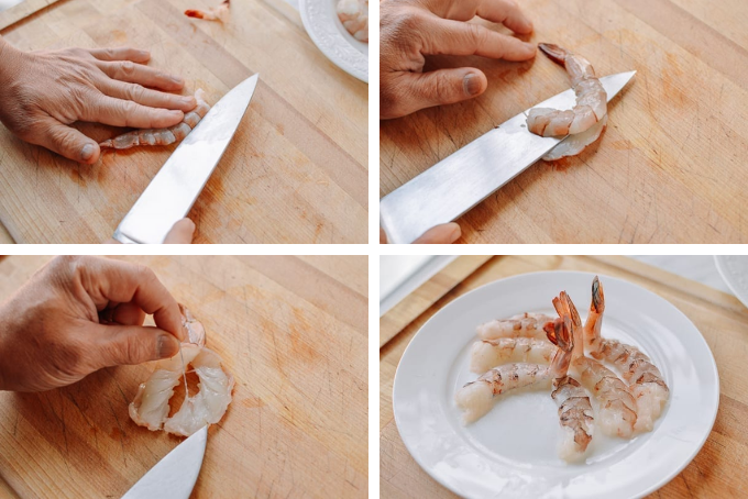 Đặt tôm nằm nghiêng, đặt lưng lên dao. Cắt khoảng 2/3 phần lưng tôm. Khi mặt sau đã được tách ra, bạn có thể dễ dàng loại bỏ đường chỉ đen. Tôm của bạn bây giờ đã sẵn sàng cho công thức của bạn!