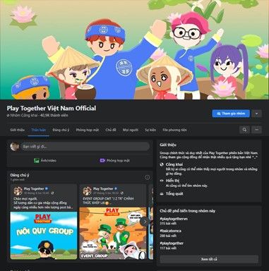 VNG giới thiệu Facebook Group cộng đồng chính thức, nơi mọi người có thể tự do trò chuyện, chia sẻ và kết nối với nhau theo chủ đề 'chơi cùng nhau' của Play Together. Đây là nơi quan trọng trong việc xây dựng một cộng đồng mạnh mẽ cho game thủ Play Together tại Việt Nam.